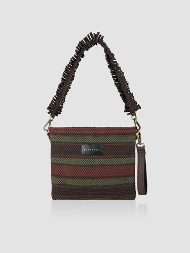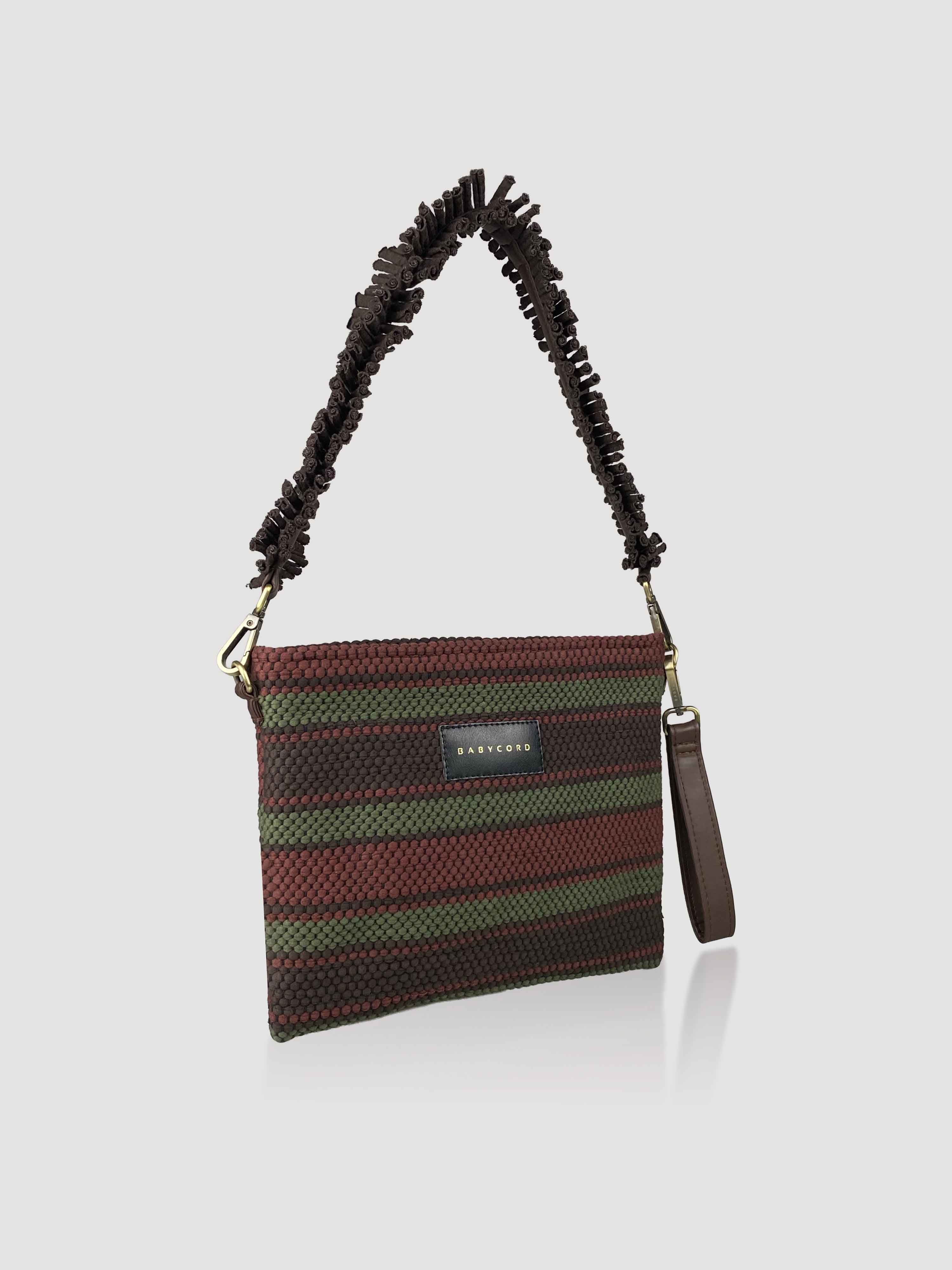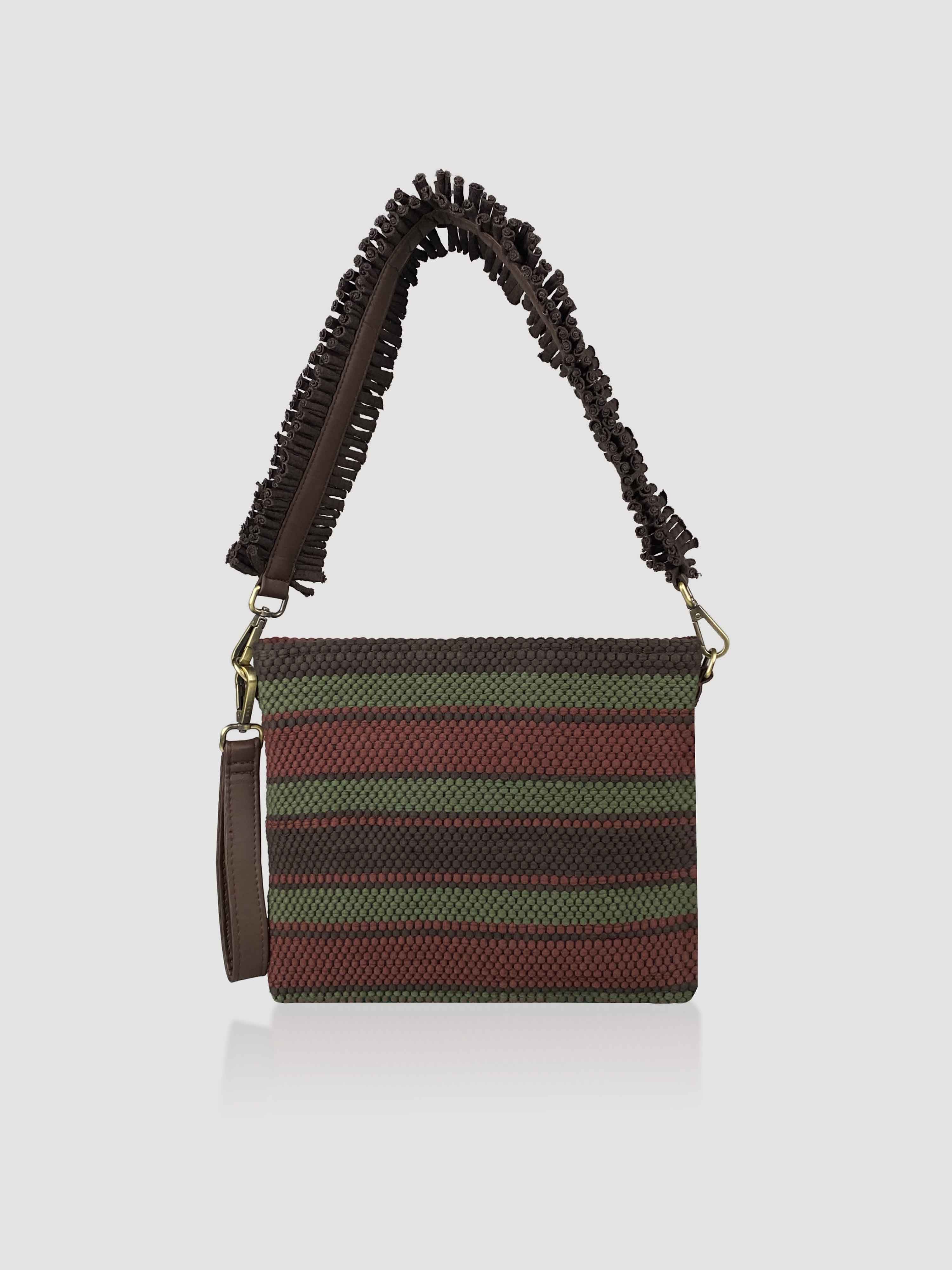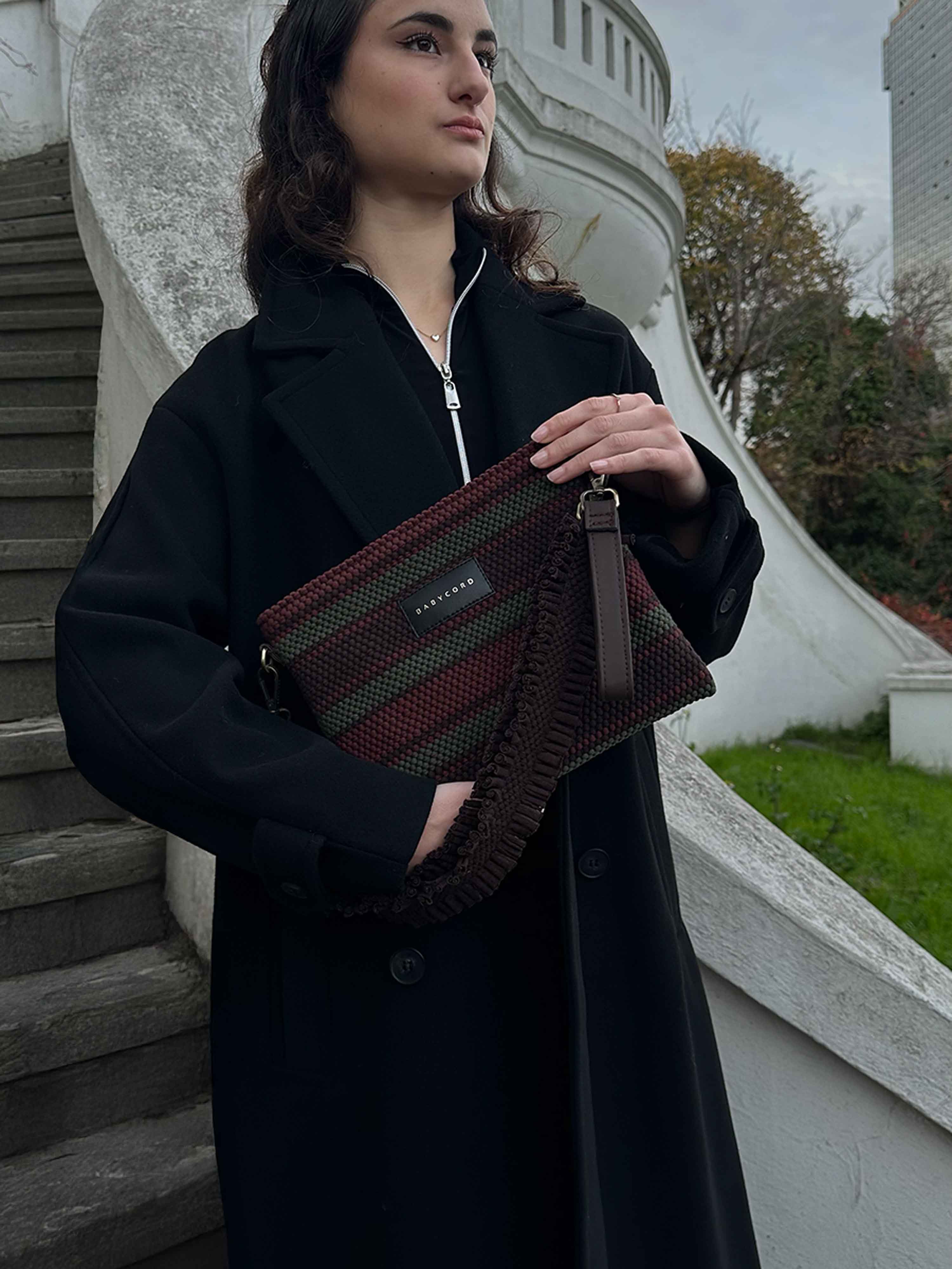 Ürün kumaşı, geri dönüşüm iplikleri kullanılarak geleneksel el dokuması yöntemi ile dokunmuştur. Türkiye’de üretilmiştir.